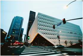 Explore Los Angeles architecture with futuristic buildings and city traffic captured at dusk.