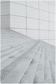 Geometric patterns on concrete stairs and wall showcasing minimalism.