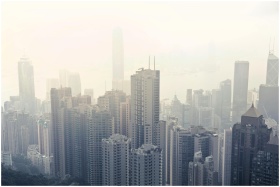 A foggy view of Hong Kong Island's skyline, featuring numerous skyscrapers and urban architecture.