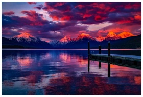 Stunning sunset over a serene lake with colorful sky and majestic mountains.