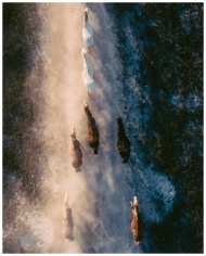 Stunning aerial view of a group of horses galloping along a dusty trail in a natural setting.