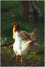 Two chickens explore a sunlit garden, showcasing natural outdoor tranquility.