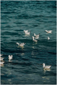 A group of seabirds, possibly black-billed gulls, gracefully float on the ocean's surface.
