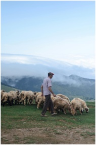A shepherd herding his flock of sheep on a grassy hillside with a scenic view of misty mountains.
