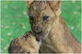 Two playful lion cubs engaging in a tender moment on a grassy field.