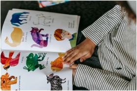 From above of crop anonymous child reading interesting book with colorful pictures of different animals