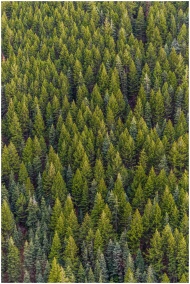 A high-angle view of a lush, vibrant pine forest, showcasing nature's beauty from above.
