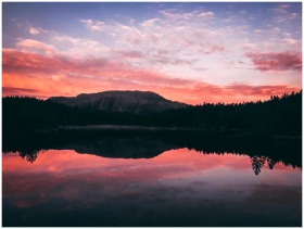 A serene sunrise over a calm lake with vivid reflections and vibrant clouds.