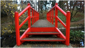 A vibrant red wooden bridge crossing a serene stream in a tranquil autumn park.