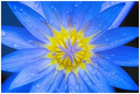 Close-up of a vibrant blue water lily with dewdrops on petals, showcasing nature's fresh beauty.