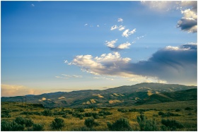 Beautiful mountain range under a blue sky with clouds, showcasing a tranquil natural landscape.