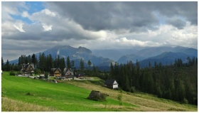 Picturesque mountain landscape in Bukowina Tatrzańska, Poland with traditional houses, lush fields, and cloudy sky.