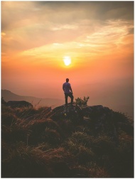 A lone hiker admires a stunning sunset view from P