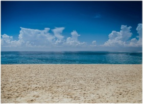A tranquil beach scene with clear skies and gentle