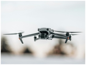 Close-up of a drone flying mid-air with propellers