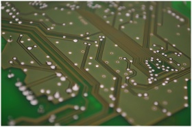 Detailed view of a printed circuit board showcasing intricate chip connections and pathways.