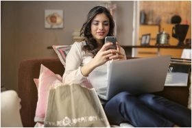 A woman enjoying leisure time on a sofa with a laptop and smartphone, showcasing a modern lifestyle.
