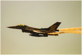 F-16 fighter jet performing an aerial maneuver leaving vapor trails in the sky.