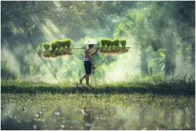 A traditional farmer carrying bundles of rice plan
