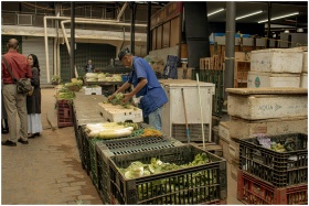 A lively indoor market with people and fresh veget