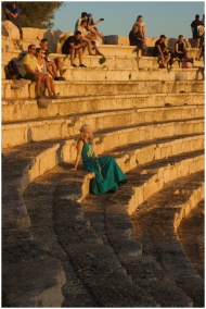 People relax in an ancient stone amphitheater during sunset, creating a serene atmosphere.