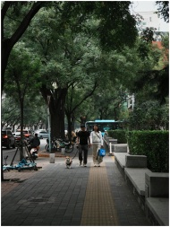 A couple walking their dog on a tree-lined city st