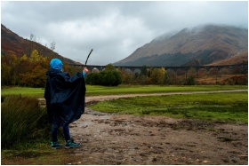 Person in raincoat exploring near the iconic Glenfinnan Viaduct with scenic autumn backdrop.