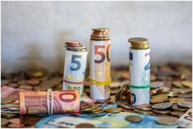 Close-up of rolled Euro banknotes and coins on a t
