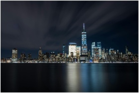 Illuminated New York City skyline featuring One World Trade Center reflecting in the river at night.
