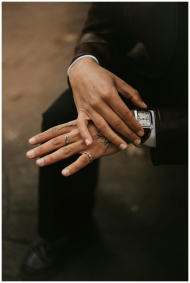 Close-up portrait of a fashionable man with tattoos and rings in Lille, France.