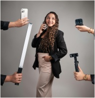 Businesswoman using tech gadgets for productivity and communication. Modern office setting.