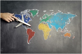 Top view of crop anonymous person holding toy airplane on colorful world map drawn on chalkboard