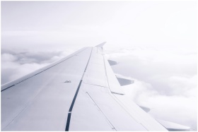A serene view of an airplane wing flying above the clouds, capturing travel essence