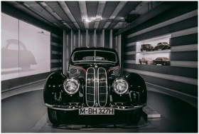 Vintage BMW car showcased in a Munich museum, highlighting automotive design history.