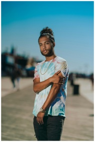 A fashionable adult male stands confidently on a sunny boardwalk in New York.