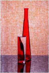 Elegant red glass bottles with unique reflections