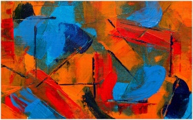 Bold and colorful abstract painting with dynamic brush strokes.