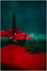 Artistic still life featuring red fabric and glassware against a green backdrop.
