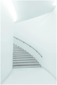 A sleek, minimalist staircase with a curved metal railing in a bright modern interior setting.