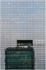Glass facade of a skyscraper in Osaka, Japan, reflecting urban architecture.