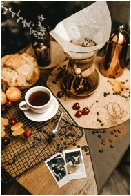 A cozy breakfast scene with coffee, bread, and cherries on a rustic table.