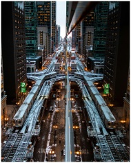 Evening cityscape of Chicago featuring illuminated train tracks amidst skyscrapers, reflecting urban life.