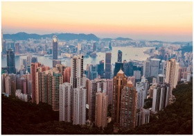 Breathtaking Kowloon skyline with skyscrapers and harbor at sunset, showcasing Hong Kong's urban beauty.
