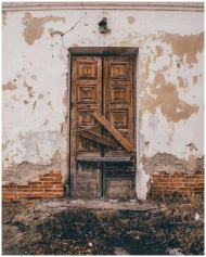 Rustic wooden door on a cracked wall of an abandon