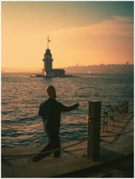 A man walks along the Bosphorus with Maiden's Towe
