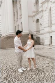 A couple in white outfits holding hands, standing by a historic building. Daytime setting.