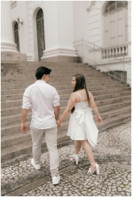 A couple in white attire walking hand in hand on historic stone steps, creating a romantic moment.