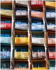Vibrant facade of a modern apartment building featuring multicolored balconies in an urban setting.