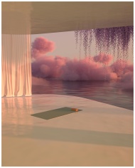 A serene indoor space with pink clouds and a yoga mat by the water, perfect for relaxation.