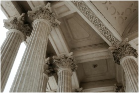 Low-angle view of ornate Corinthian columns showcasing intricate classical architecture.